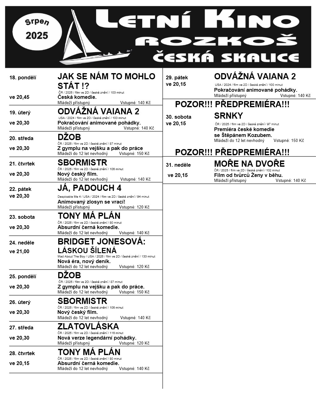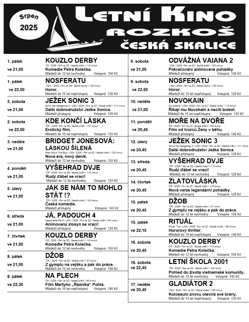 Letní kino promítá o prázdninách, částečně kryté sezení, občerstvení v kině i v areálu autocampingu